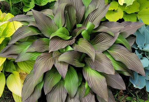 Длинные темно-зеленые листья с большими частями сезона с темно-красным румянцем на листьях. Лавандовые цветы. Высота 35-40 см. Тень/полутень. Лист намного "краснее", чем у First Blush. Скрещивание Tekila Sunrise х First Blush.