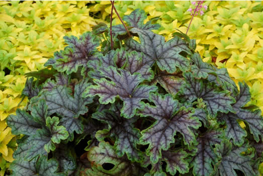Разрезные и рельефные листья с зеленым краем и центральной светлой областью, глубоко прорезанной темно-красными прожилками. Весной и летом центр между прожилками имеет синевато-пурпурный отлив и более зеленый к осени. Цветоносы высотой 50 см, цветки яркие, теплого розового цвета. Куст пышный, диаметром 35-40 см и высотой до 20 см. |