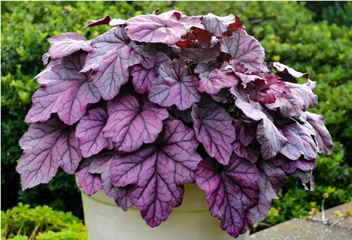 Весной листья полуглянцевые пурпурно-розового цвета с металлическим блеском и тёмными прожилками, в течение сезона меняют цвет на более тёмный фиолетовый. Высота до 25-30 см, ширина 40-50 см |