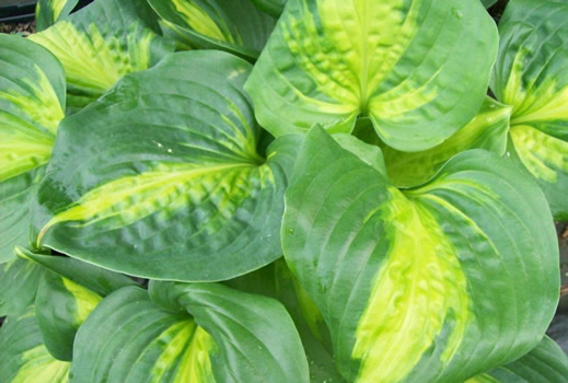 Большие, округлые, выпуклые листья с желтой серединой и темно-зеленой широкой окантовкой.