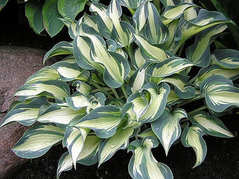 Синий лист в форме сердца, с белым центром, который медленно становится зеленым в течении лета. Полутень-тень. Высота 30-35 см. Спорт от H. 'Halcion'