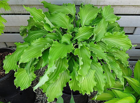 Удлиненно-блестящие темно-зеленые листья с гофрированной каймой. Цветы лилово-пурпурные. Высота 45-50 см.