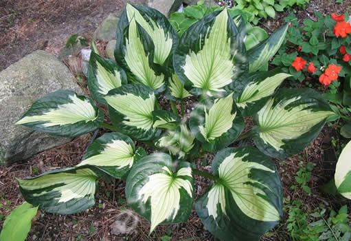Вихрь зеленых листьев с белой серединой, позже меняющий цвет на сливочный. Лавандовые цветы. Средняя хоста. Высота 30 см.
