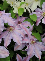Цветки диаметром 17-20 см, светло-голубовато-фиолетовые с серебристым оттенком и светло-пурпурной полосой посередине лепестка. Лепестки с острыми кончиками и волнистыми краями. Группа обрезки-2-я. Высота 2-3 м. |