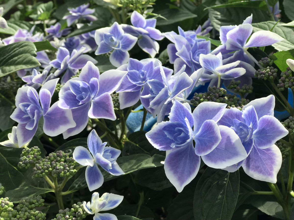 Соцветие махровое, двухцветное, биколор, лепестки, заостренные, голубые с белыми краями, в зависимости от кислотности. Образует компактный густой округлый куст. Очень прочные стебли. Высота куста - 0,8 - 1.2 м. Подходит для ПАТИО и срезки. |