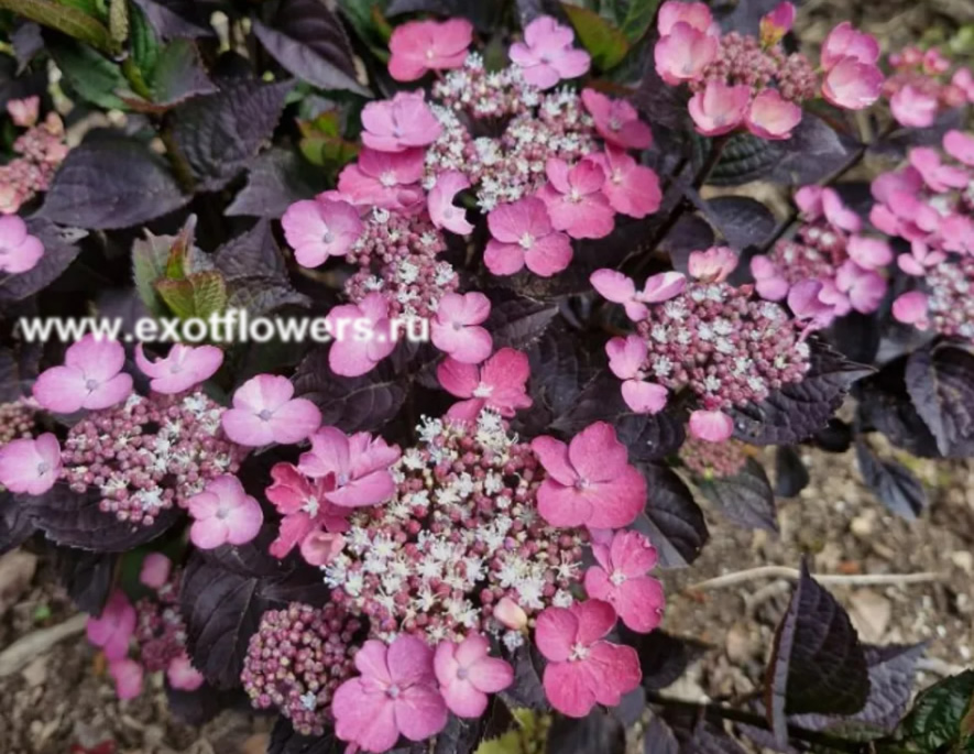 Пильчатая гортензия. Темно-красные молодые побеги, на которых которые летом появляются ярко-розовые кружевные цветки (на кислой почве цветки темно-пурпурного цвета). В конце цветения засохшие цветки темно-красного цвета сохраняют свой цвет и держатся всю зиму. Цветы и темно-шоколадная блестящая листва красиво контрастируют. По сравнению с другими разновидностями пильчатых гортензий, у этого сорта листва летом остается очень темной (даже на солнечном месте).