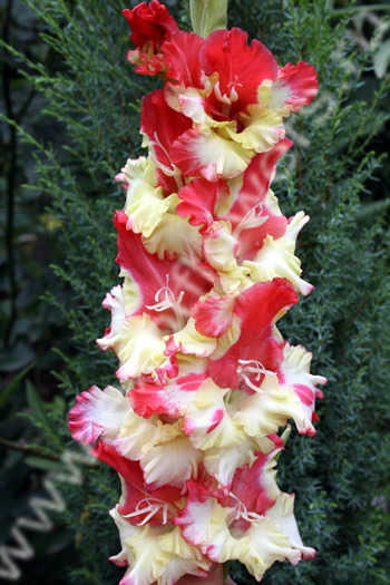 Верхние лепестки красные, нижние кремово-желтые с красными кончиками. Окраска