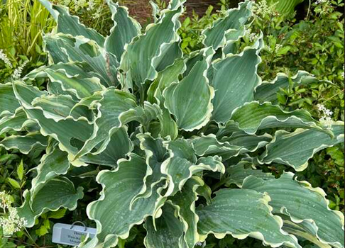 Чрезвычайно гофрированные листья создают у этой хосты впечатление, будто она «танцует» в тенистом саду. Края листьев загибаются, создавая гофрировку, которая тянется от кончика листа вниз по всей длине черешка. Листья сизо-голубые с сильной гофрировкой и широкой кремово-белой каймой. Почти белые цветки расположены на пропорциональных цветоносах, впервые появляясь в середине лета. Высота 30 см. |