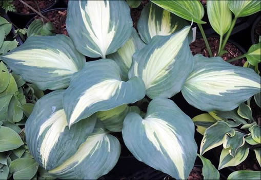 Сердцевинный лист среднего размера, сине-голубой с широкой белой полосой по середине листа. Высота 30 см. Суперновинка!! |