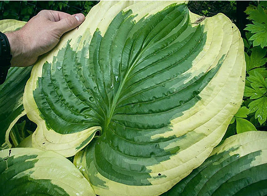 -M.Groothuis Очень крупные зеленые листья с широкой светло-желтой каймой, переходящей в белую. Крупная хоста с бледно-лавандовыми цветками, которая растет как в полутени, так и в полной тени. Высота от 120 до 140 см, рост средний. Одна из самых крупных пестролистных хост. |