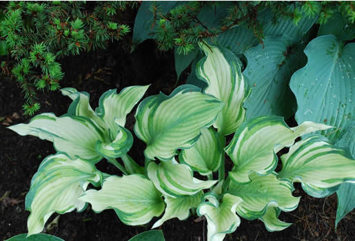 Листья плотные, гофрирован-ные, по весне белые с сине-зеленой каймой, позже становятся сизо-зелеными. Цветы светло-лавандовые. Высота 40-50 см. Редкая коллекционная хоста. Спорт H. "Krossa Regal'".