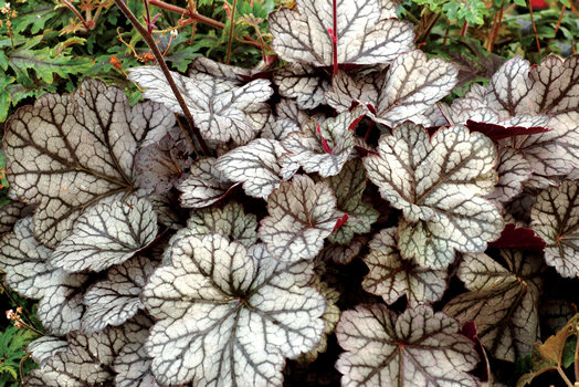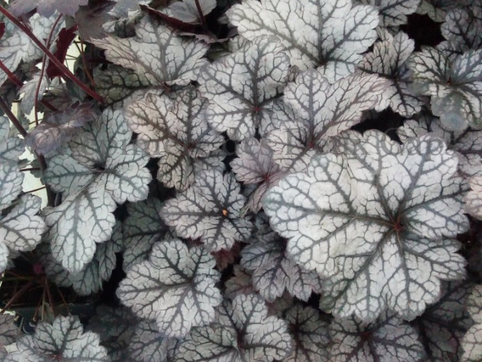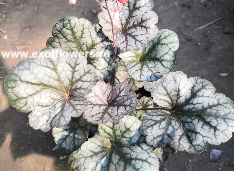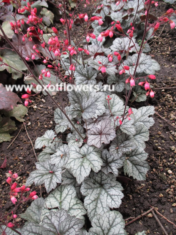 Листья серебристые, с контрастными почти черными прожилками, обратная сторона листьев фиолетовая. Цветки фуксиново-красные, цветоносы 40 см высотой.