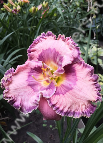 -F.Smith, 11 Сорт с цветками округлой формы. Основной цвет розовый. Фиолетовый глаз и гофрированная кайма. По краю лепестков тонкая серебряная нить. D-17 см. H-80 см. TET, SEV |