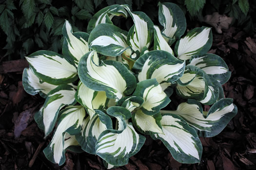 Сильно-волнистые перекрученные белые листья с широким сине-зеленые краем. Цветы светло-лавандовые.