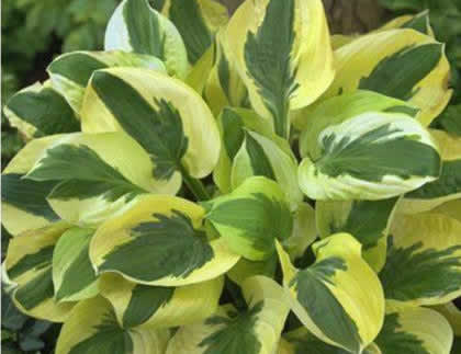 Листья чашевидные, темно-зеленые с широкой кремово-белой каймой, которая затем белеет. Цветки лавандовые. Высота 30 см.