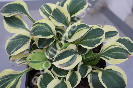 Небольшая плотная куртина из листьев с кремово-белой каймой. Листовая пластинка размером 6 x 5,7 см, очень плотная,