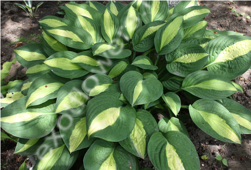 Зеленый лист с желтой серединкой, с белой каймой по середине пятна. Солнце/тень. Высота 35-40 см.