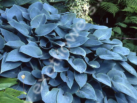 Сочные, сине-зеленые листья сердцевинной формы. Бледно-сиреневые цветы. Средняя хоста.