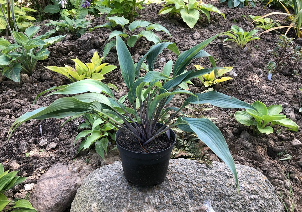 -Yan Khurup Khansen. Плотные, узкие ланцетовидные синие листья на пурпурных черешках. Форма листа напоминает наконечник копья. Высота 30 см. |