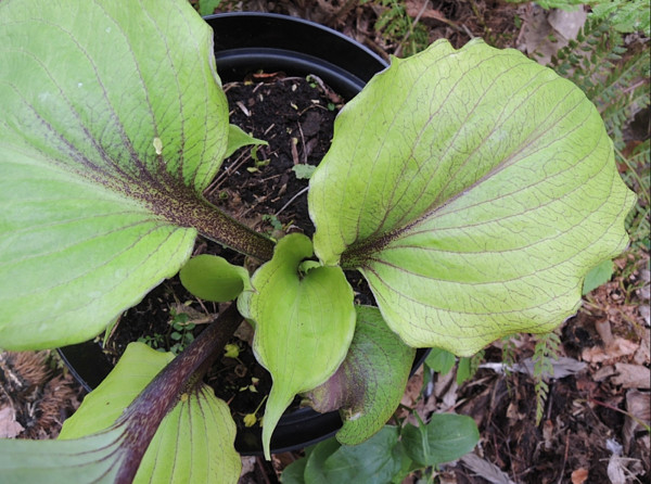 Светло-зеленый лист с коричневыми прожилками, заходящие с черешков растения. Тетраплоидный спорт хосты Valley’s Kumo/ Высота 30 см. |