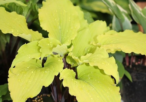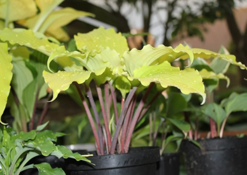 - J. Linneman Ярко-желтые, заостренные листья с сильно гофрированными краями держатся на ярко-красных черешках. Позже в сезоне становится светло-зеленым. Хоста с лавандовыми цветками, которая растет как в полутени, так и в полной тени. Высота от 35 до 40 см, рост средний. |