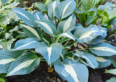 Листья сине-зелёные с красивым белым центром. Цветки бледно-лавандовые. Цветение в июле. Место полутенистое или тенистое. Высота 40 см и шириной 75 см. Спорт от H. " Kiwi Full Monty ".