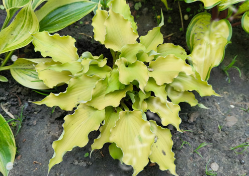Листья золотисто-желтые с волнистым краем и заостренным кончиком. Низ листа белый.