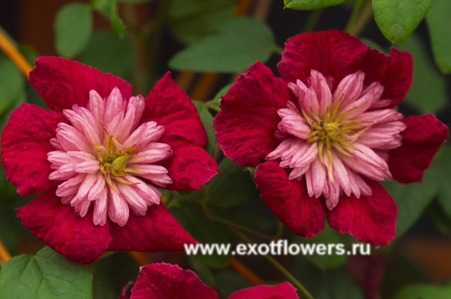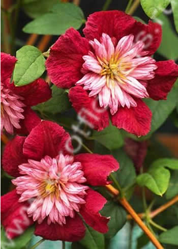 Английская селекция. Махровые, внешние лепестки темно-красные, внутренние узкие, розовато-белые.