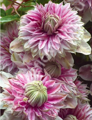 Эфеектные, всегда махровые: насыщенно-розовые с более темной полосой по лепесткам. Цветок в форме помпона (как у сорта Blue light), внешние чашелистники, их около 8 и многочисленные внутренние, меньше по размеру. Обильное цветение с мая по июнь, вторая волна с августа-сентября. Вторая группа обрезки. Высота 2-2,5 метра. Английская селекция.