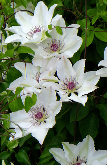 Цветок белый, с контрастными темно-красными тычинками. Крупные цветы, диаметром 18 см. Группа обрезки 2-я. Высота 2-3 м. Особенно хорош для выращивания у ограждений, стен, беседок, пергол, решёток. |