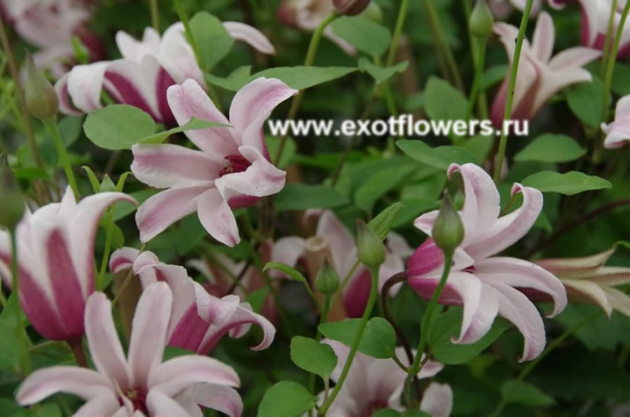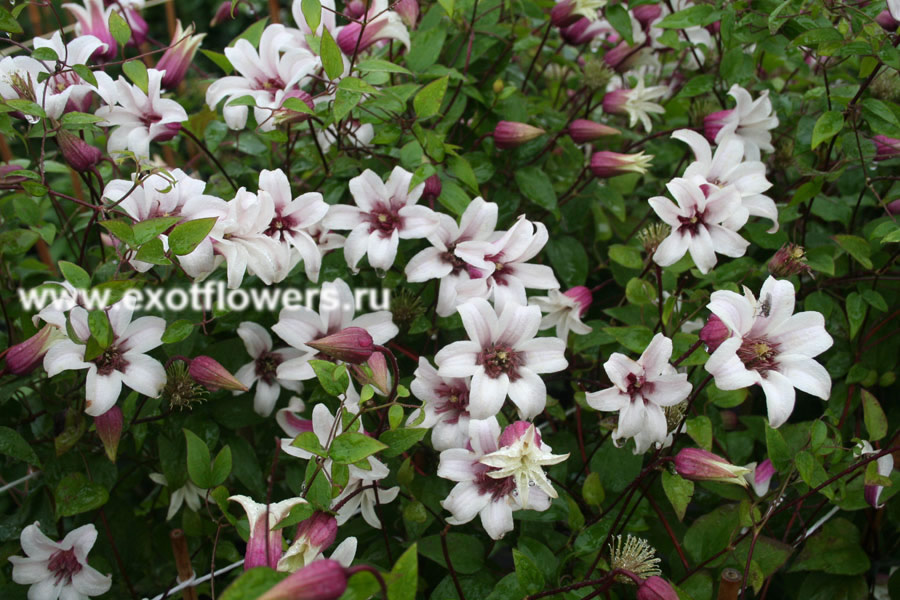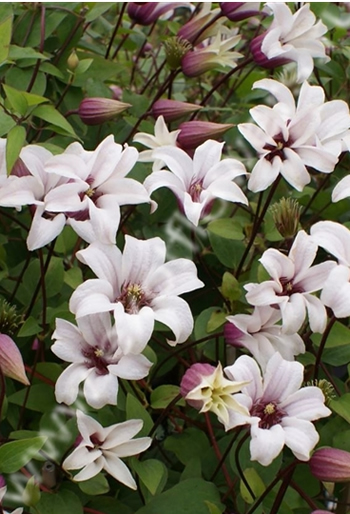 Цветки диаметром 4-6 см, внутри белые, снаружи фиолетовые. Цветёт в конце июня-сентябре на побегах текущего года. На зиму требуется укрытие более тщательное, чем для клематисов других групп. Высота 400 см.