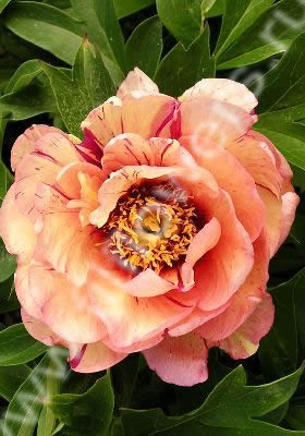 Полумахровый/махровой формы. Гибрид-Itoh. Золотисто-кремово-желтый с розово-персиковым