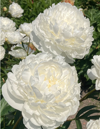 Форма цветка розовидная. Крупный махровый цветок белого цвета, в центре лепестки имеют более кремовый оттенок. Требуется опора для поддержки крупных цветков. Диаметр цветка - 16 см. Высота растения - 70 см. |
